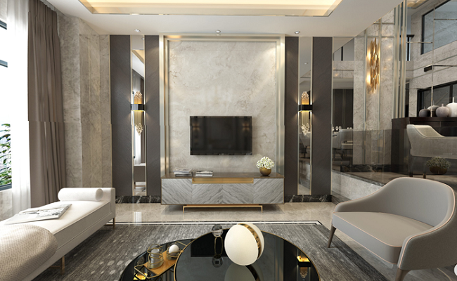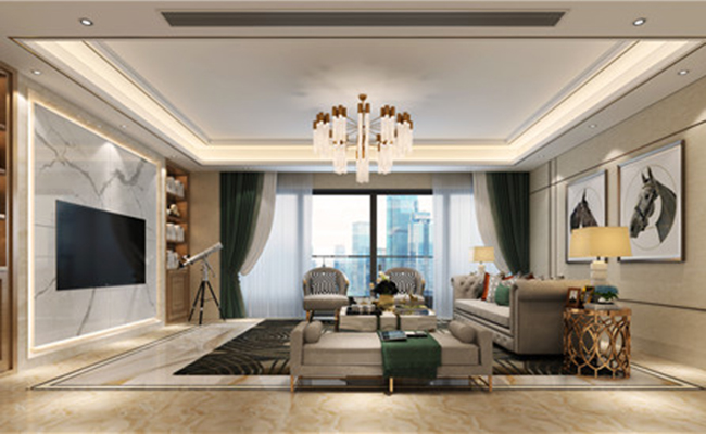 整體設(shè)計以輕奢風格為主導(dǎo),追求一種簡約而不失高雅的氣質(zhì)。通過大理石、金屬等材質(zhì)的運用,以及精致的裝飾細節(jié),營造出一種低調(diào)奢華的氛圍。 ?色彩搭配?:采用了米色、白色、金色等經(jīng)典輕奢色調(diào)。米色的墻面與地面奠定了空間的柔和基調(diào),白色大理石的電視墻增添了純凈與高雅,金色的裝飾元素則起到了點綴和提升質(zhì)感的作用,使整個空間在色彩上達到和諧統(tǒng)一。 材質(zhì)與質(zhì)感 ?高品質(zhì)材質(zhì)?:選用大理石作為電視墻和吧臺的主要材質(zhì),不僅展現(xiàn)出自然的紋理和光澤,還提升了空間的品質(zhì)感和價值感。金屬元素如燈具的框架、家具的腿等,以其精致的質(zhì)感和反光特性,為空間增添了一份現(xiàn)代感和奢華感。