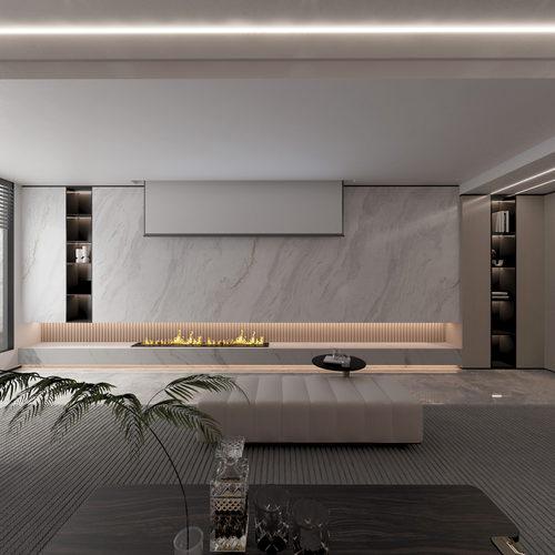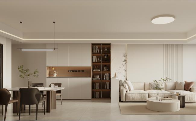 本設計以現代輕奢為核心,融合法式輕奢的精致線條與現代家居的實用功能。客餐區采用開放式布局,米白色護墻板搭配大理石紋理飾面,勾勒出優雅的空間基底;焦糖色絨布餐椅、寶藍色單椅形成撞色視覺焦點,金屬雕花、水晶裝飾等細節點綴其中,糅合了奢華質感與現代簡約。自然花藝與藝術擺件的融入,讓空間在精致奢華中兼具生活溫度,打造出兼具儀式感與舒適度的現代家居體驗。