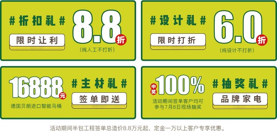 活動(dòng)期間(6月17日-7月8日),簽單下定業(yè)主可享受設(shè)計(jì)費(fèi)6折,人工8.8折簽單優(yōu)惠,還可獲贈(zèng)價(jià)值16888元德國進(jìn)口貝朗智能馬桶一個(gè),7月8日可到財(cái)富廣場(chǎng)東塔參與品牌家電抽獎(jiǎng),百分百有獎(jiǎng),數(shù)量有限,抽完即止。