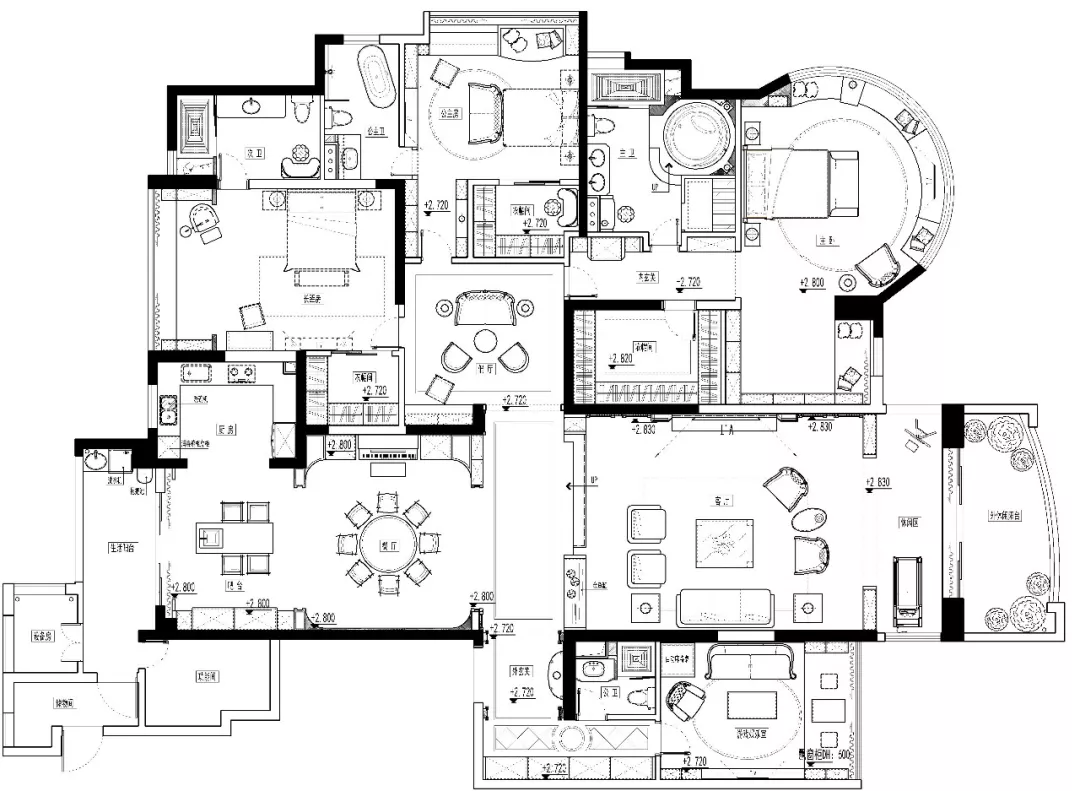 大理石打造出的圓形浴缸區(qū)域是衛(wèi)生間的重頭戲,配以兩個(gè)恰到好處的壁龕,營造出奢華與浪漫的氛圍。