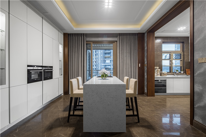 靠近生活陽臺(tái)的西餐臺(tái),家人朋友在此,或圍坐聊天,或飲酒淺酌,既溫馨又不乏生活情趣,可謂一半煙火,一半清歡。