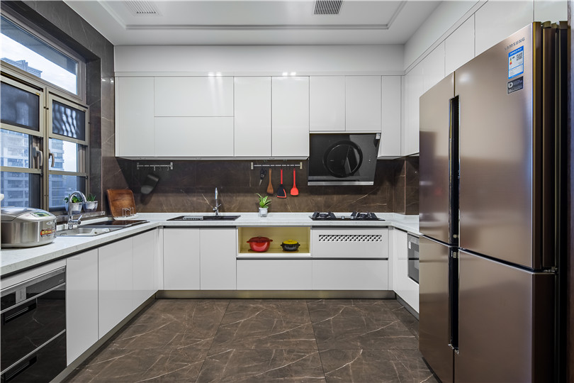 開放式廚房依舊是采用利落的線條,白色與咖色的組合,點(diǎn)綴其間的小綠植,讓廚房充滿了浪漫人文氣息。