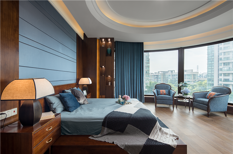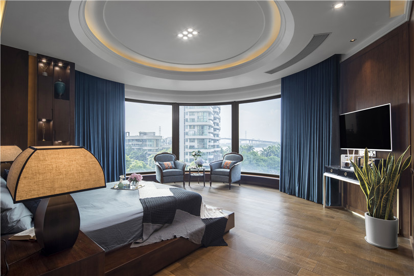 270°落地窗是主臥的亮點(diǎn),搭配藍(lán)色天鵝絨的窗簾,無論白天還是夜晚,這里都時(shí)時(shí)透露著典雅與時(shí)尚。
