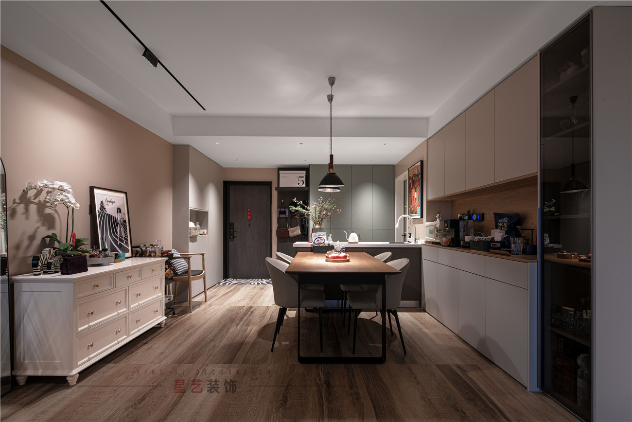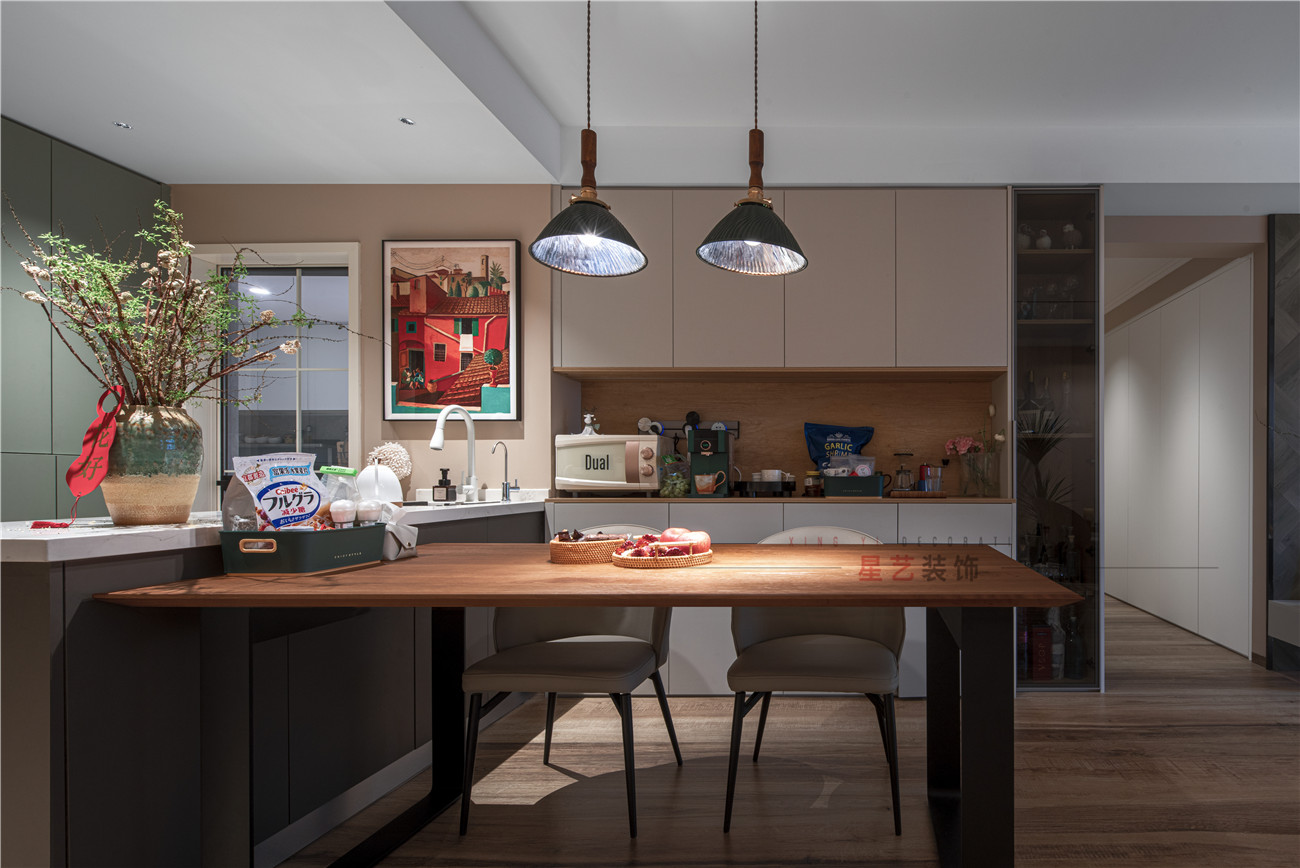 餐廳部分也是個多功能區,設置了大量的儲物柜,用餐區采用吧臺的設計,連接洗手臺,最大程度的節省了空間,內嵌的置物臺也可以作為茶水區,便利了生活又恰到好處。