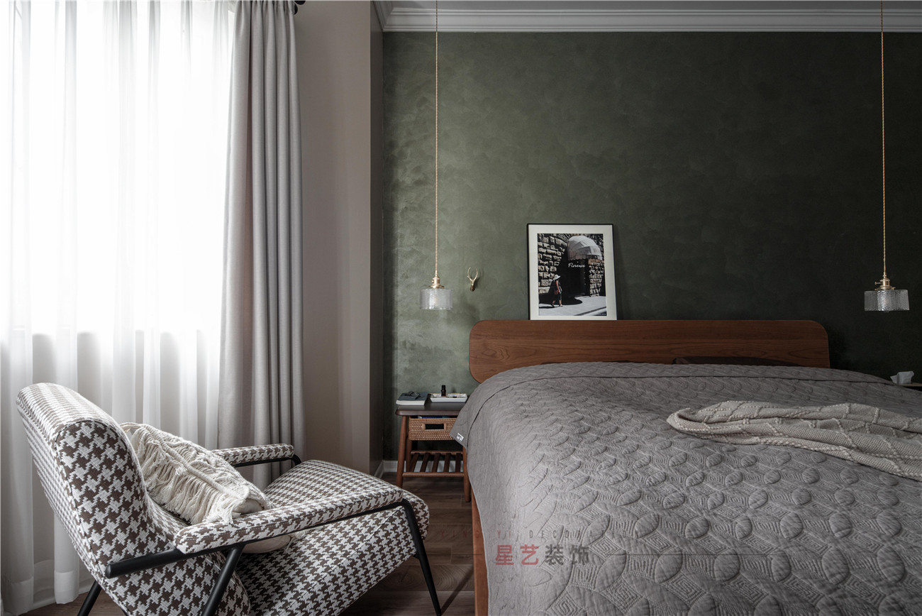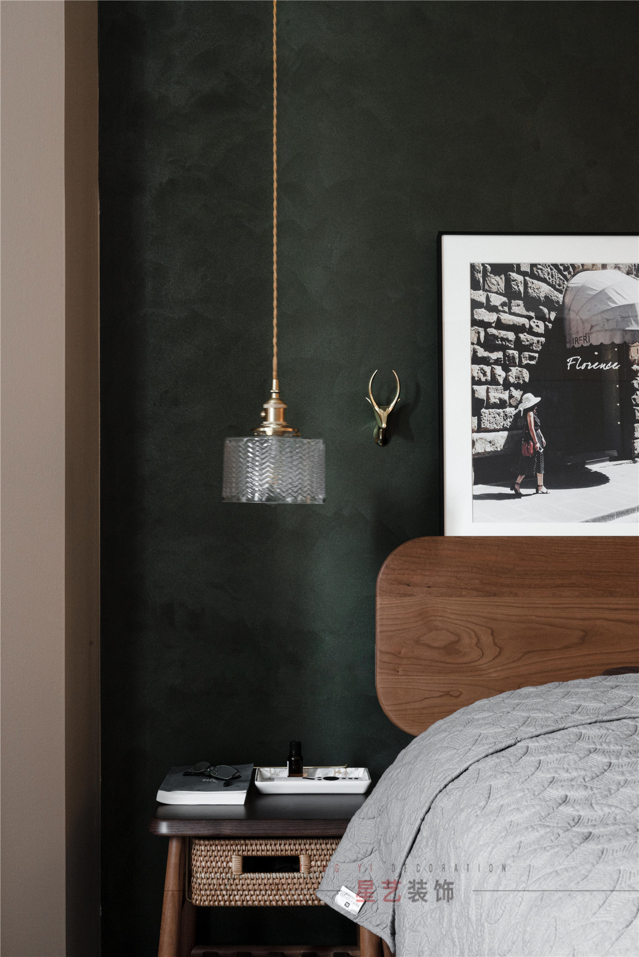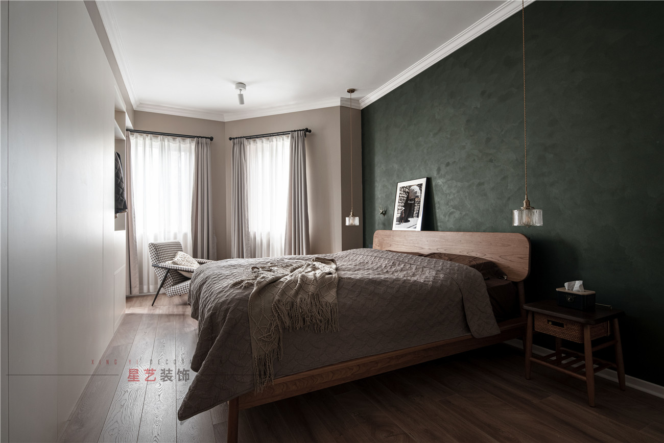 臥室用大面積的墨綠色背景奠定了整體的色彩基調,不規則的房型設計,編織收納籃,和鹿形裝飾讓整個房間都顯得獨特又靈動,同時兼具成穩與大氣,這也是設計師的獨具匠心之處。