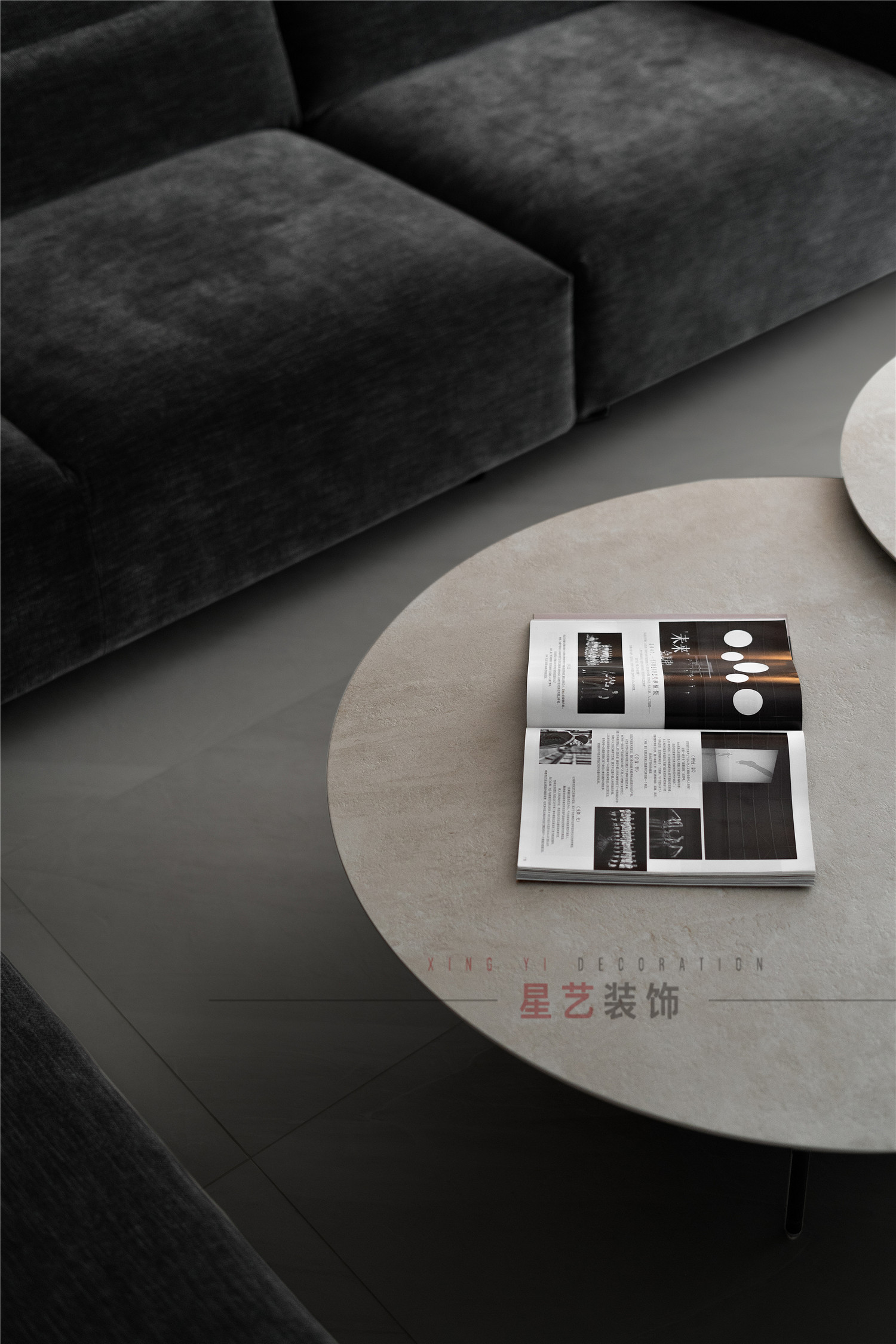 客廳是經典的黑白灰設計,極簡風格盡顯高級大氣,柔軟舒適的絨面深色沙發搭配拼接圓桌,簡約精致又賦予時尚魅力,整體上僅用色彩的沖擊與家具的質感展現設計的精妙。