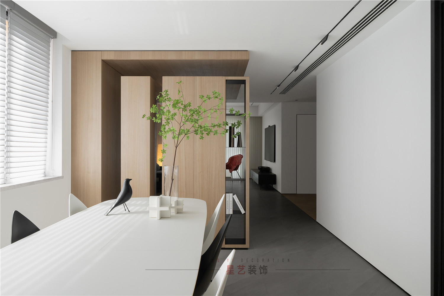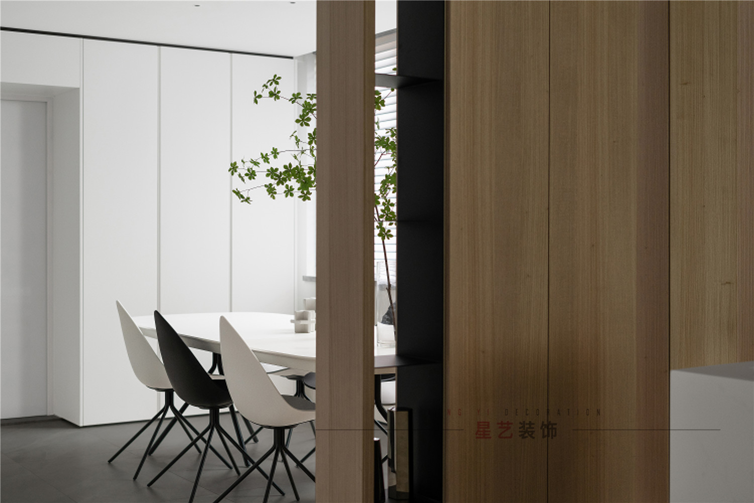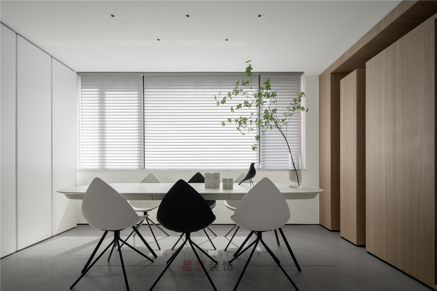 餐廳部分清新明亮,大面積的百葉窗與白色儲物柜在視覺上延伸用餐區的空間,黑白相間的桌椅虛實結合,讓整個空間有了沉穩的底色,像是化雪后清晨,迸發勃勃生機。