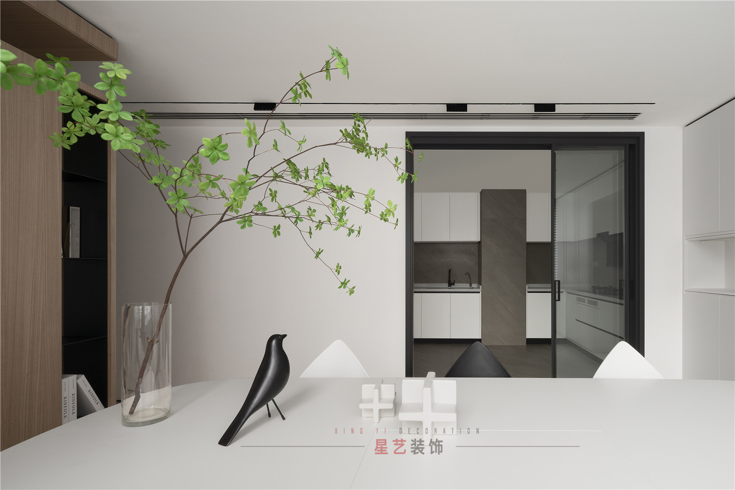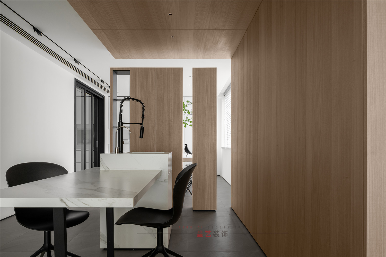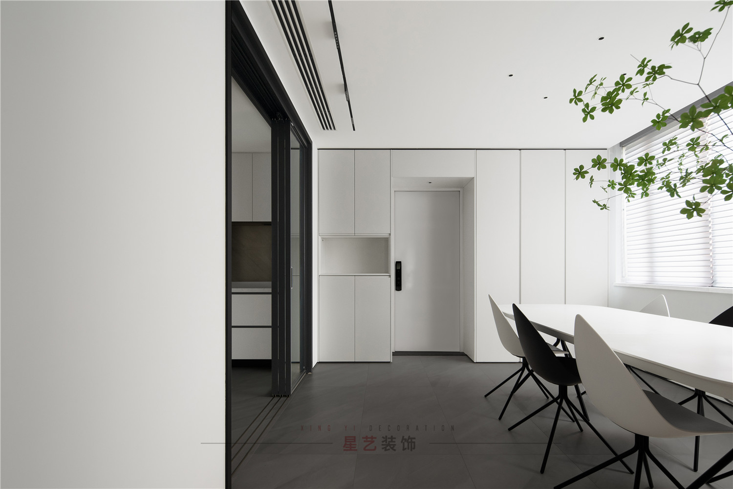 餐廳部分清新明亮,大面積的百葉窗與白色儲物柜在視覺上延伸用餐區的空間,黑白相間的桌椅虛實結合,讓整個空間有了沉穩的底色,像是化雪后清晨,迸發勃勃生機。
