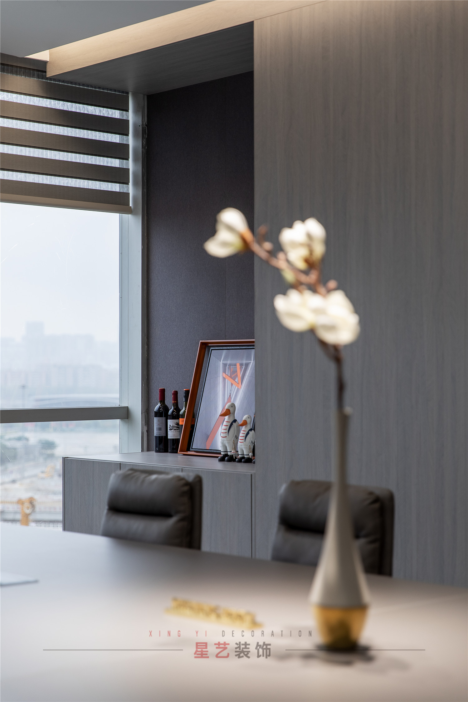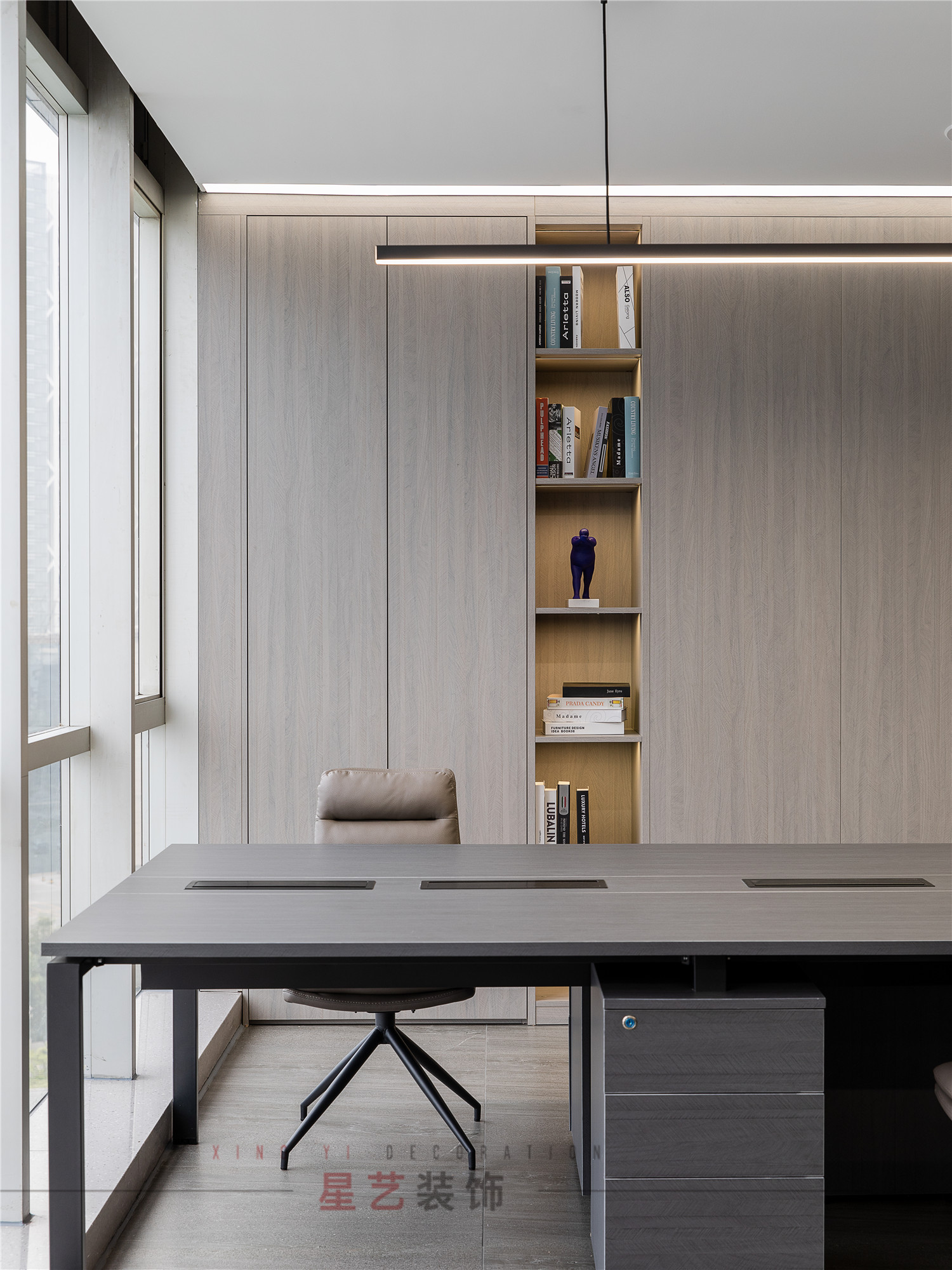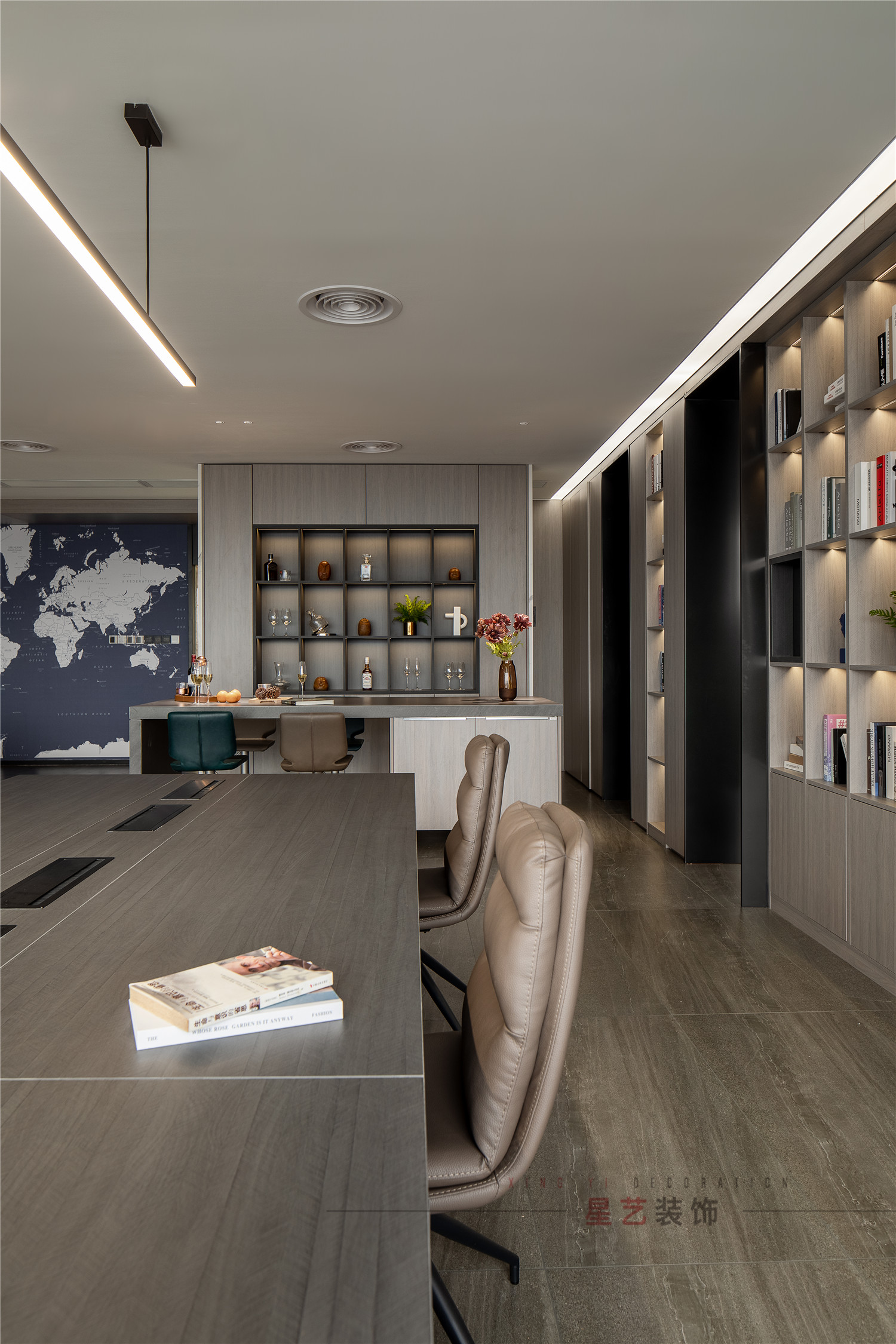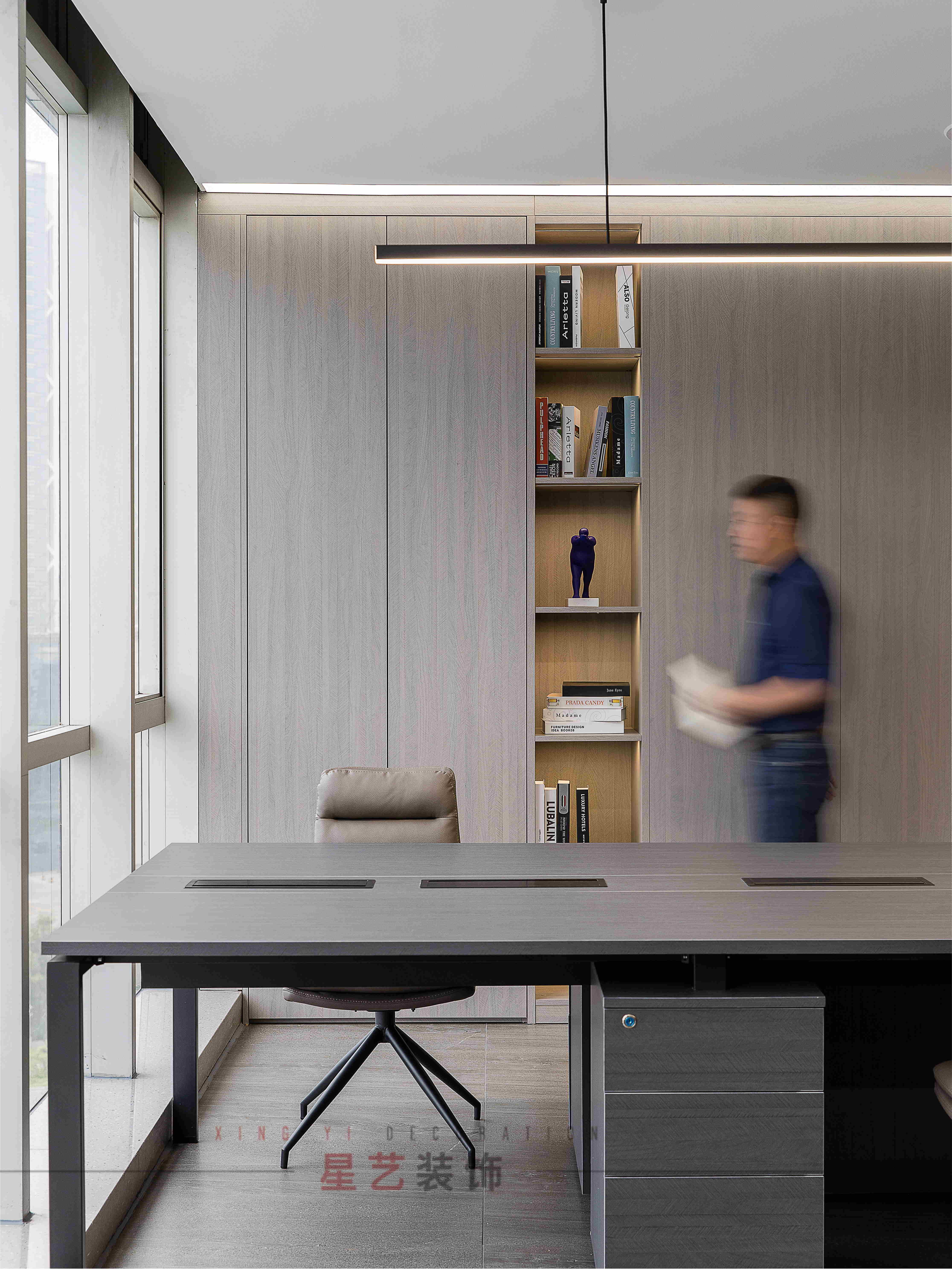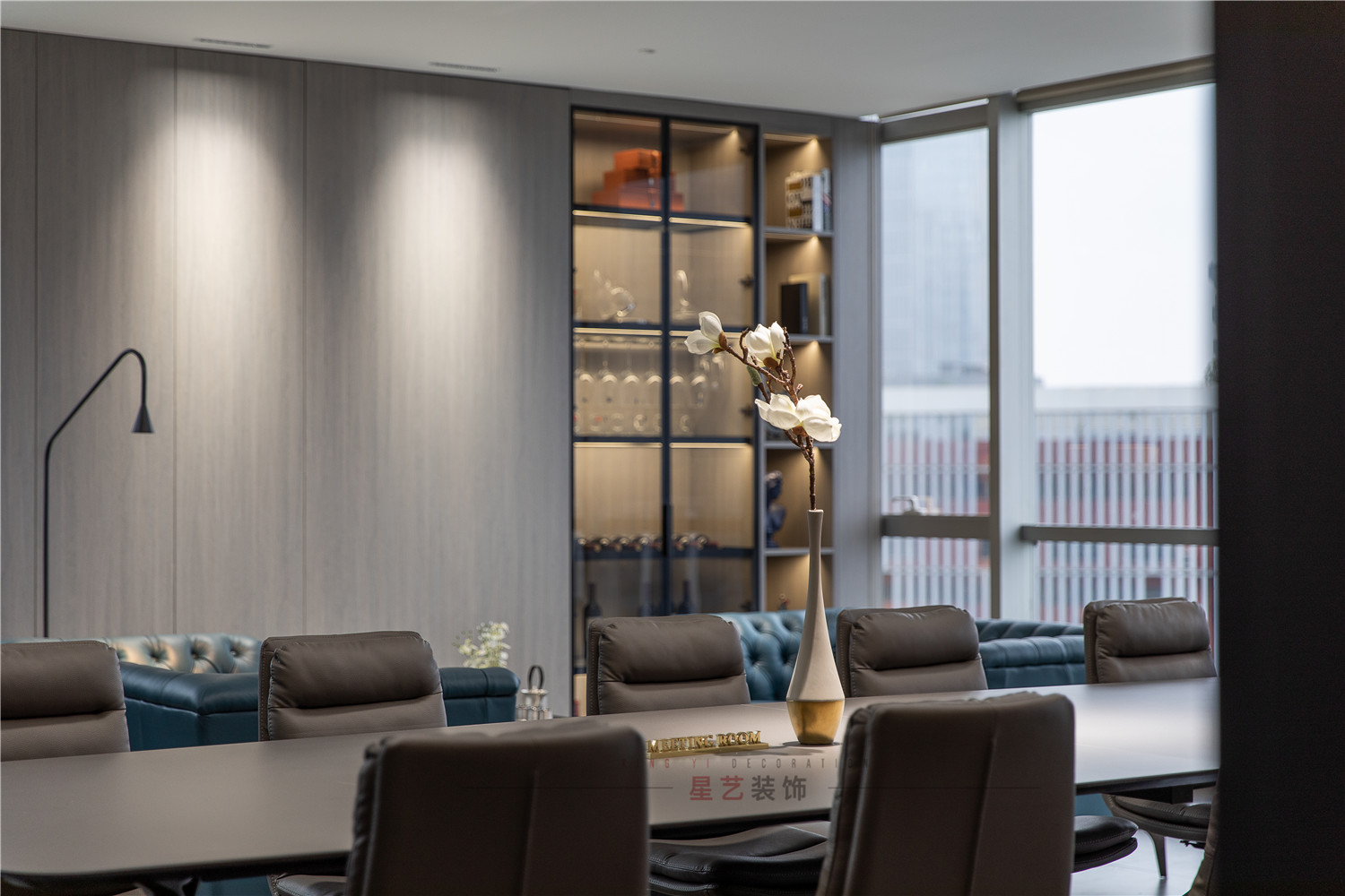 會議區(qū)也可作為接待區(qū),休息區(qū),學(xué)習(xí)區(qū),隱形儲物柜實(shí)用又美觀,整面的落地窗讓整個(gè)空間干凈明亮,既能享受家的愜意,也能減少工作帶來的的浮躁與不安。