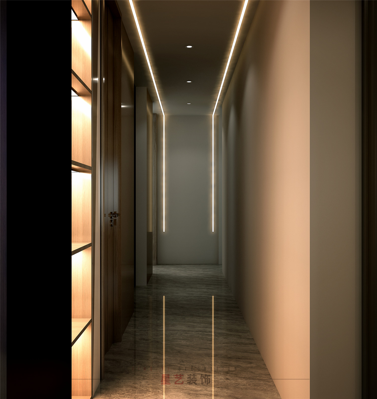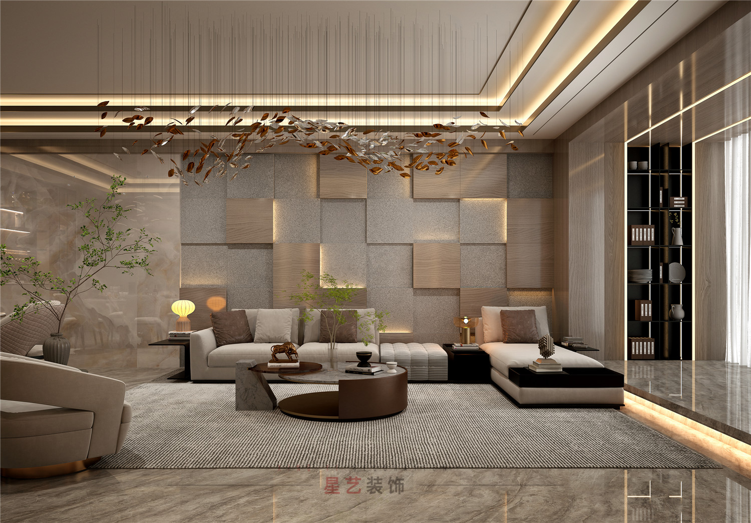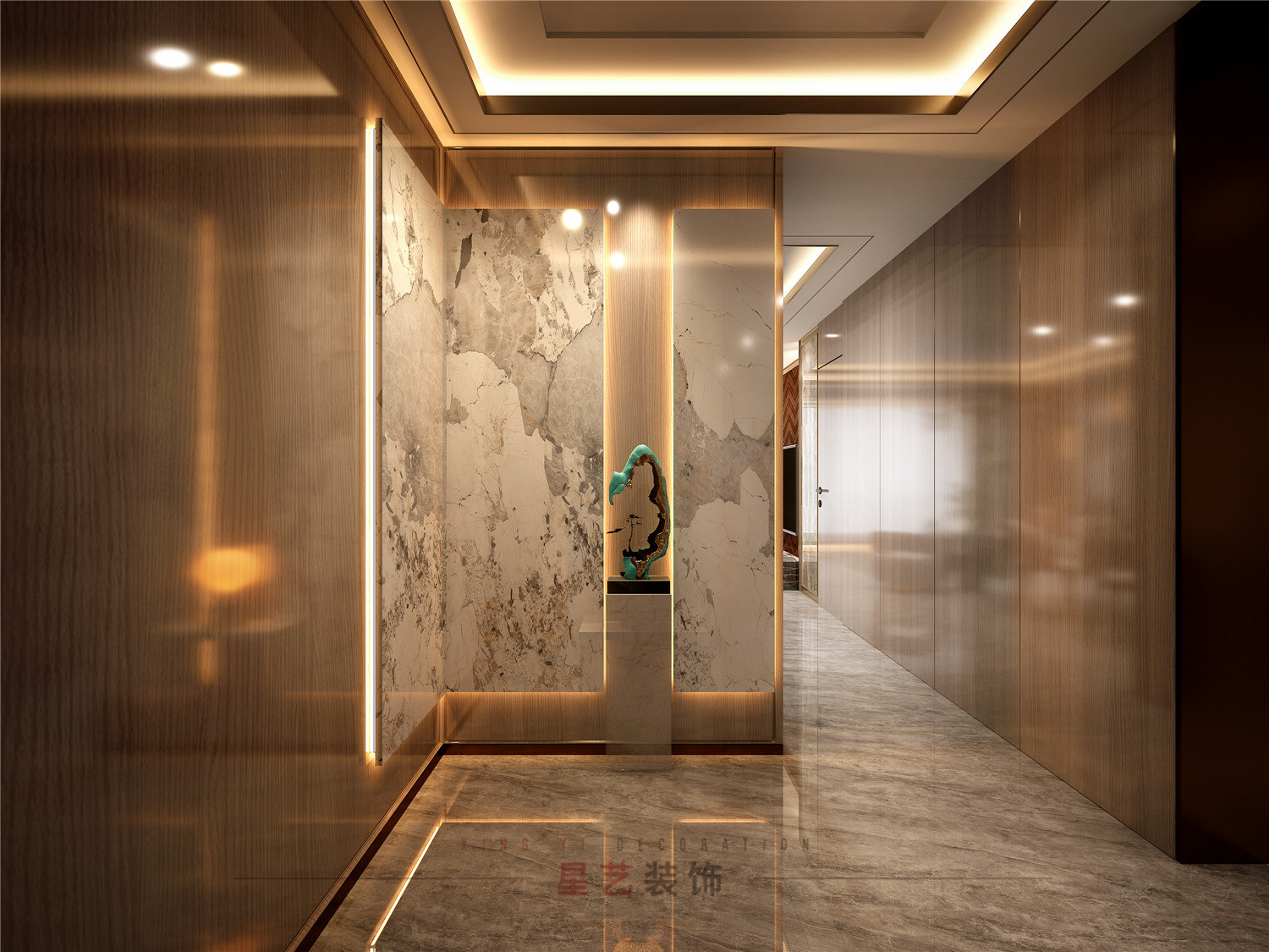進(jìn)來(lái)玄關(guān),滿眼都是余暉落日中的浩瀚星空。輕奢細(xì)致的軟裝布置與現(xiàn)代材質(zhì)組合,尤其是靈活的線燈布置,上一秒沉溺于晚霞的浪漫,下一秒便回歸科技生活,使“自然”與“奢華”這兩種不同的氣質(zhì)得以共生。