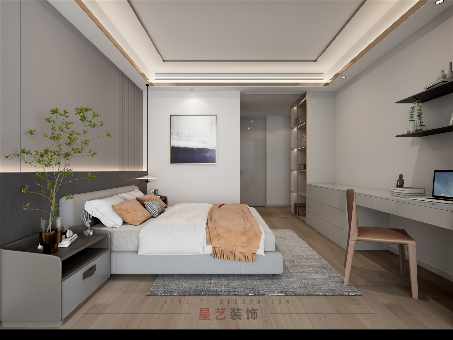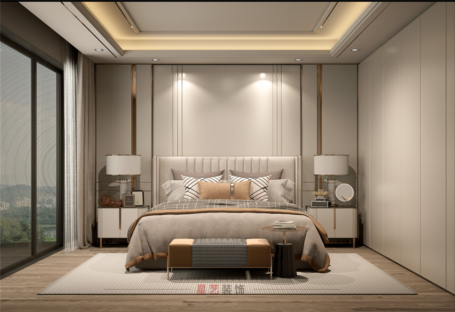 主人房與長(zhǎng)輩房風(fēng)格比較相似,對(duì)稱式的空間分割方式表現(xiàn)出細(xì)膩的質(zhì)感層次,布局上疏密有度,簡(jiǎn)繁相適。