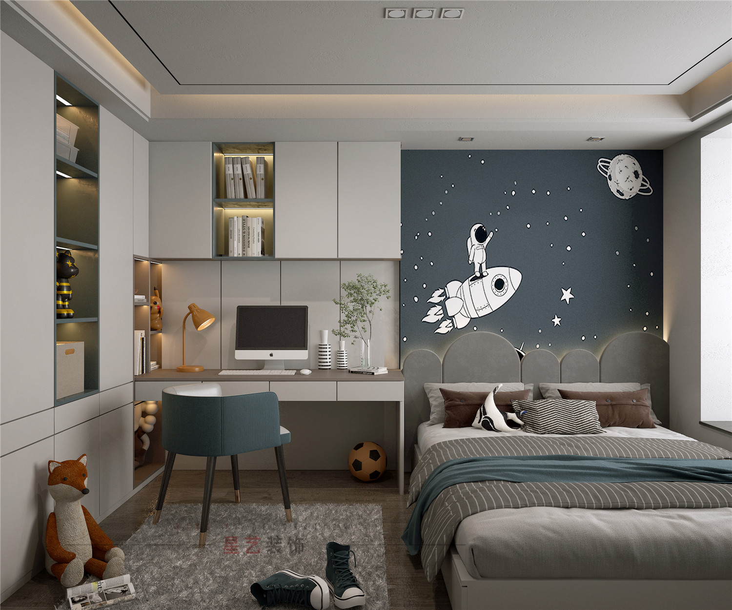 當(dāng)孩子降生到這個(gè)世上,天上就會(huì)亮起一盞燈,所以有了星星。平常給孩子多一些想象,保持天真,這也是一種超能力。小孩房添上一抹藍(lán)綠色,那是青春邁向成長(zhǎng)的顏色。