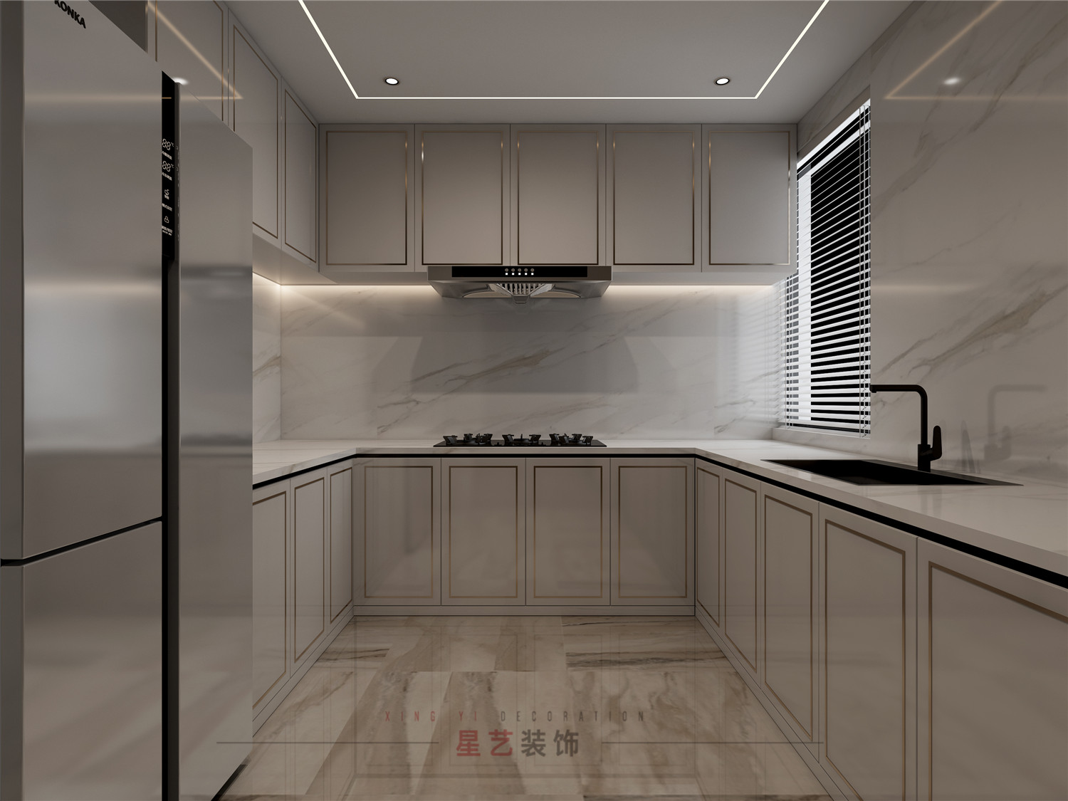 廚房以經(jīng)典的黑白組合搭配金屬邊框點(diǎn)綴,大理石墻面與地面相呼應(yīng),設(shè)計(jì)感、線條感、質(zhì)感,都到達(dá)一個(gè)適度的狀態(tài)。