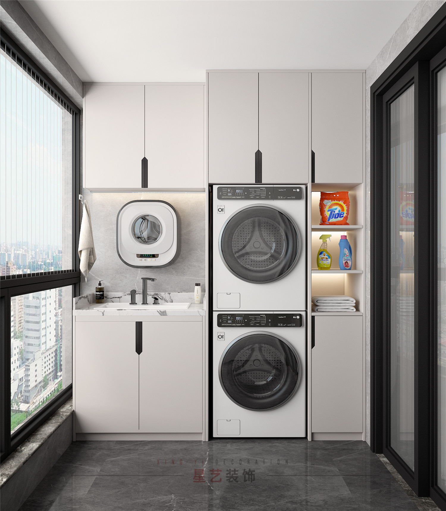 陽(yáng)臺(tái)上布置洗衣機(jī),洗手池與置物柜,將空間的時(shí)尚奢華提升到一個(gè)新的水平。
