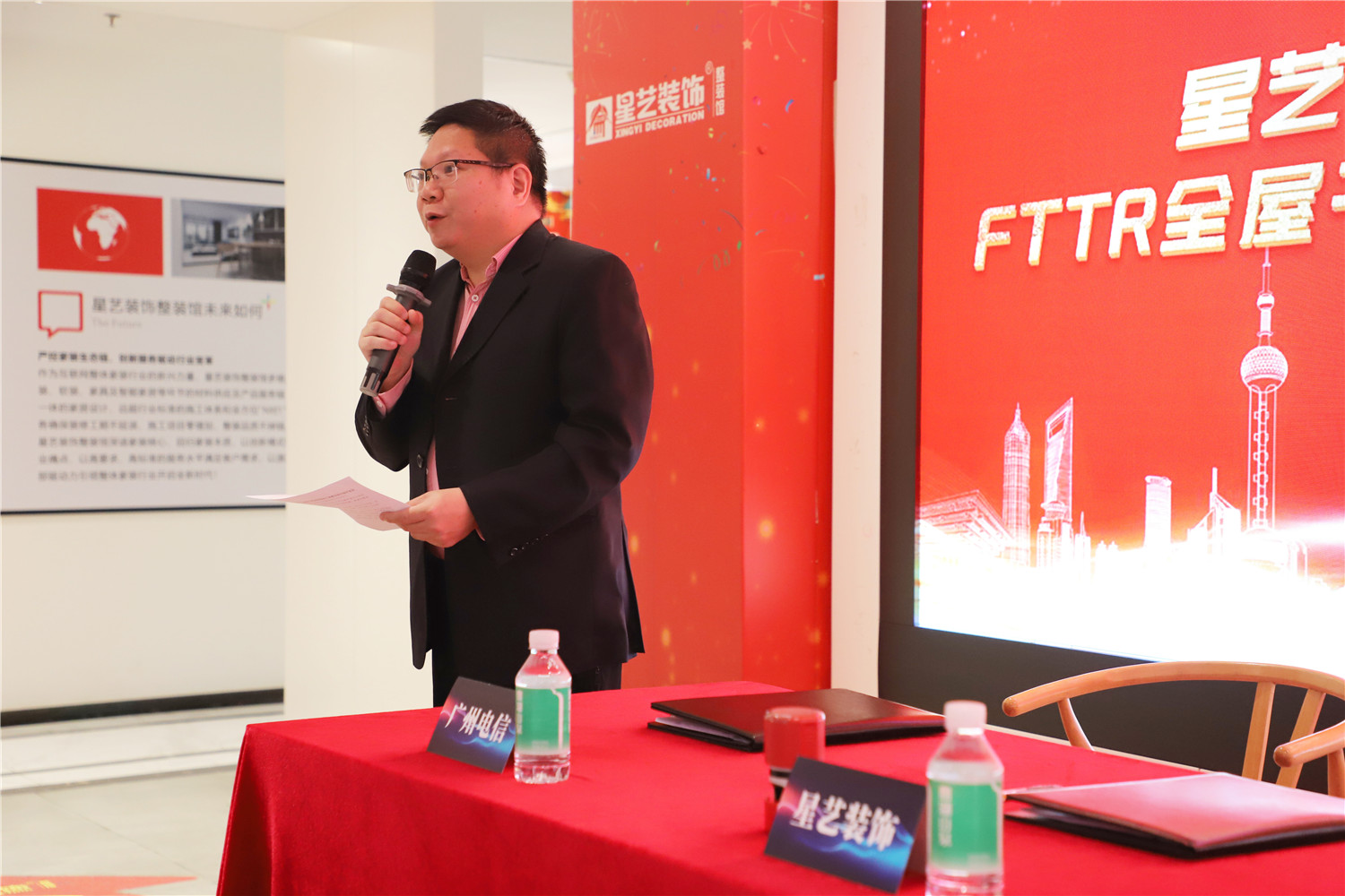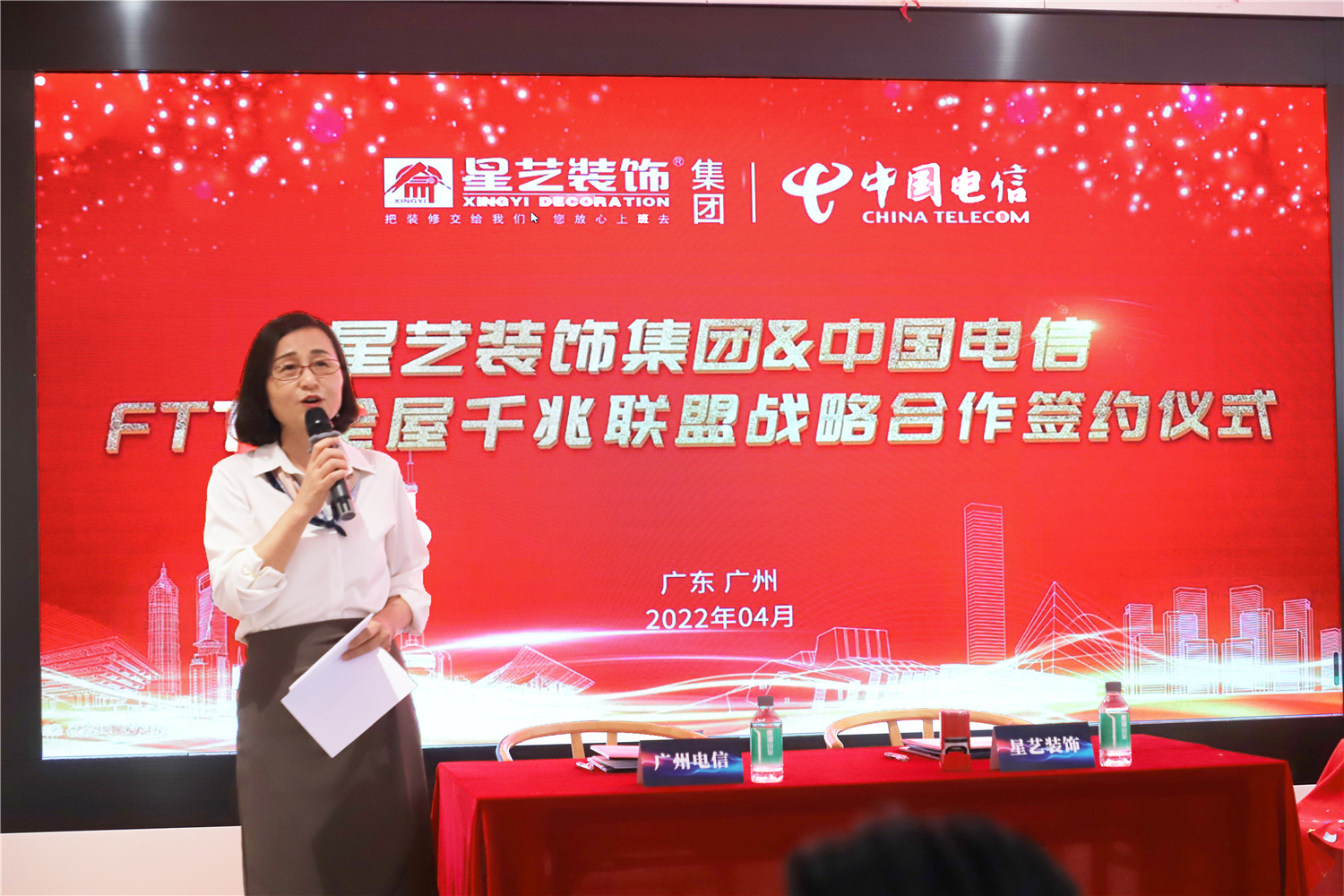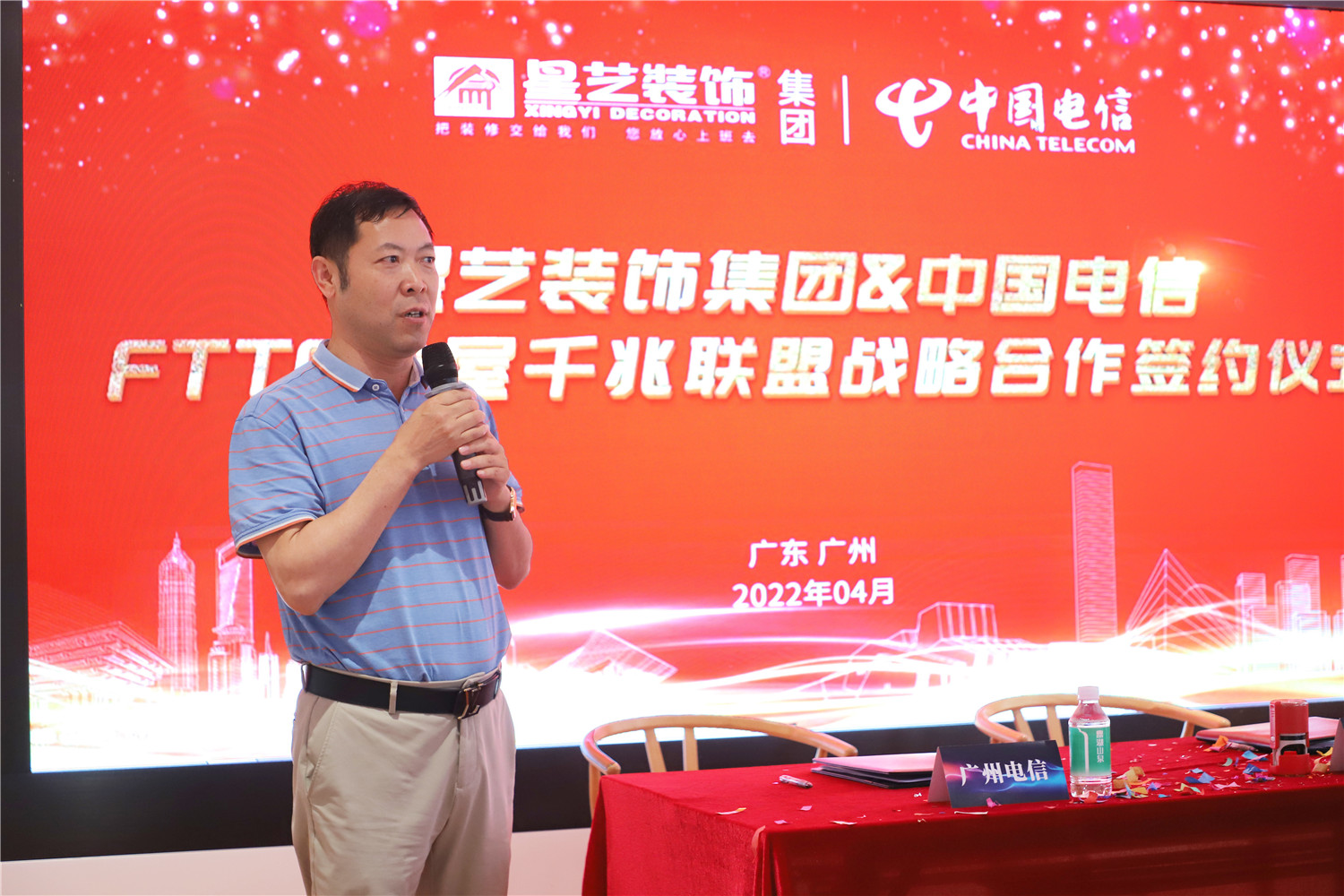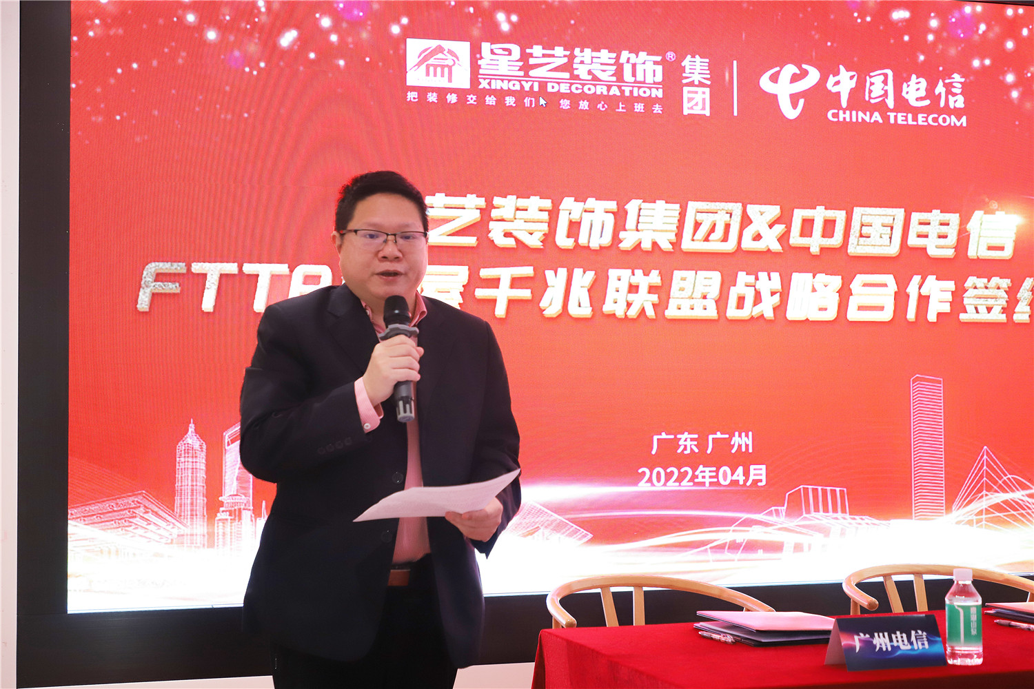 簽約儀式現(xiàn)場(chǎng),星藝裝飾廣州分公司總經(jīng)理柯志強(qiáng)、星藝裝飾廣州分公司副總經(jīng)理劉亦萍,中國電信廣州分公司關(guān)堅(jiān)成分別進(jìn)行了致辭發(fā)言。