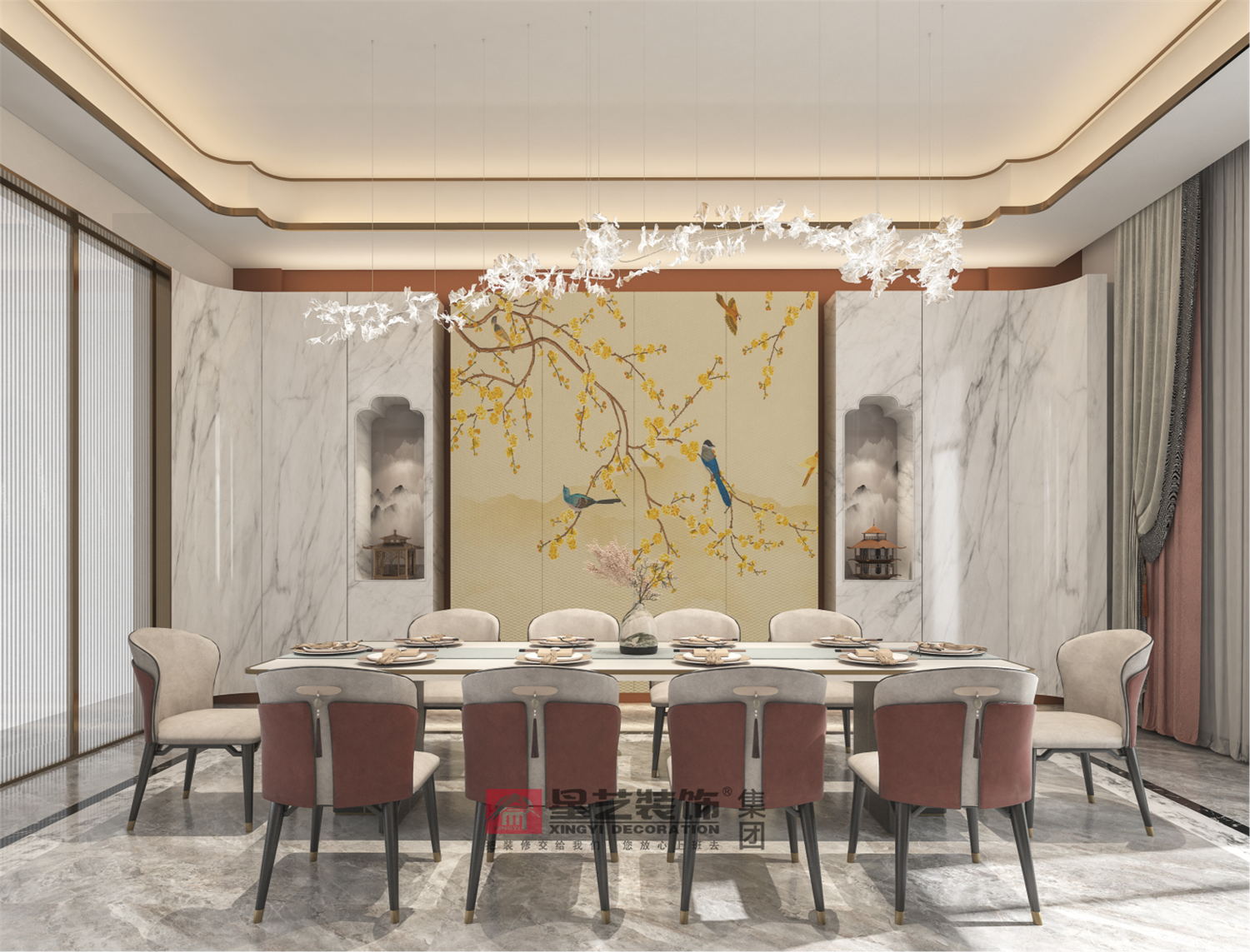 定制銀杏葉飛鳥水晶吊燈,與門廳元素相呼應。“喜鵲聲唶唶,俗云報喜鳴?!北尘爱嬛邢铲o立于枝頭帶來不盡的祥瑞與美好,在兩旁水墨遠山的映襯下散發著迷人的東方浪漫情調。