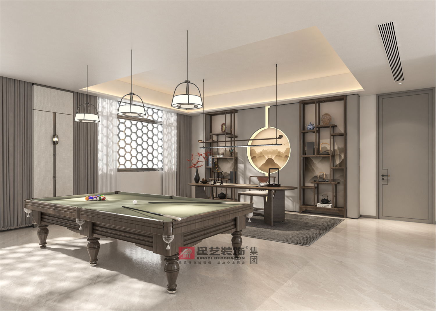 地面采用女主人喜歡的銀杏葉與祥云元素,配上隔斷屏風隔而不斷,即起到風水上的擋煞作用。并以石材原木與金屬為主要材質,把東方氣韻下的低調典雅呈現的淋漓盡致。