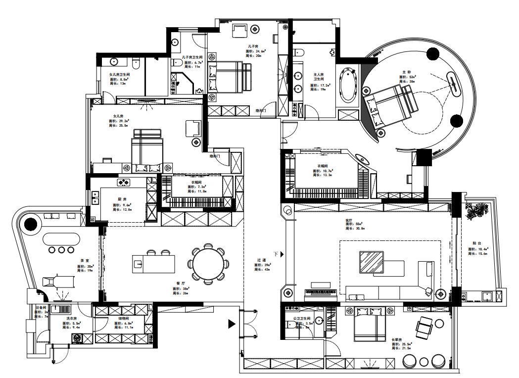 這套房子,是業(yè)主一家三代的主要生活場所。6口之家,空間功能的豐富性不能少,日常起居、大人辦公、全家觀影等需求一并滿足。